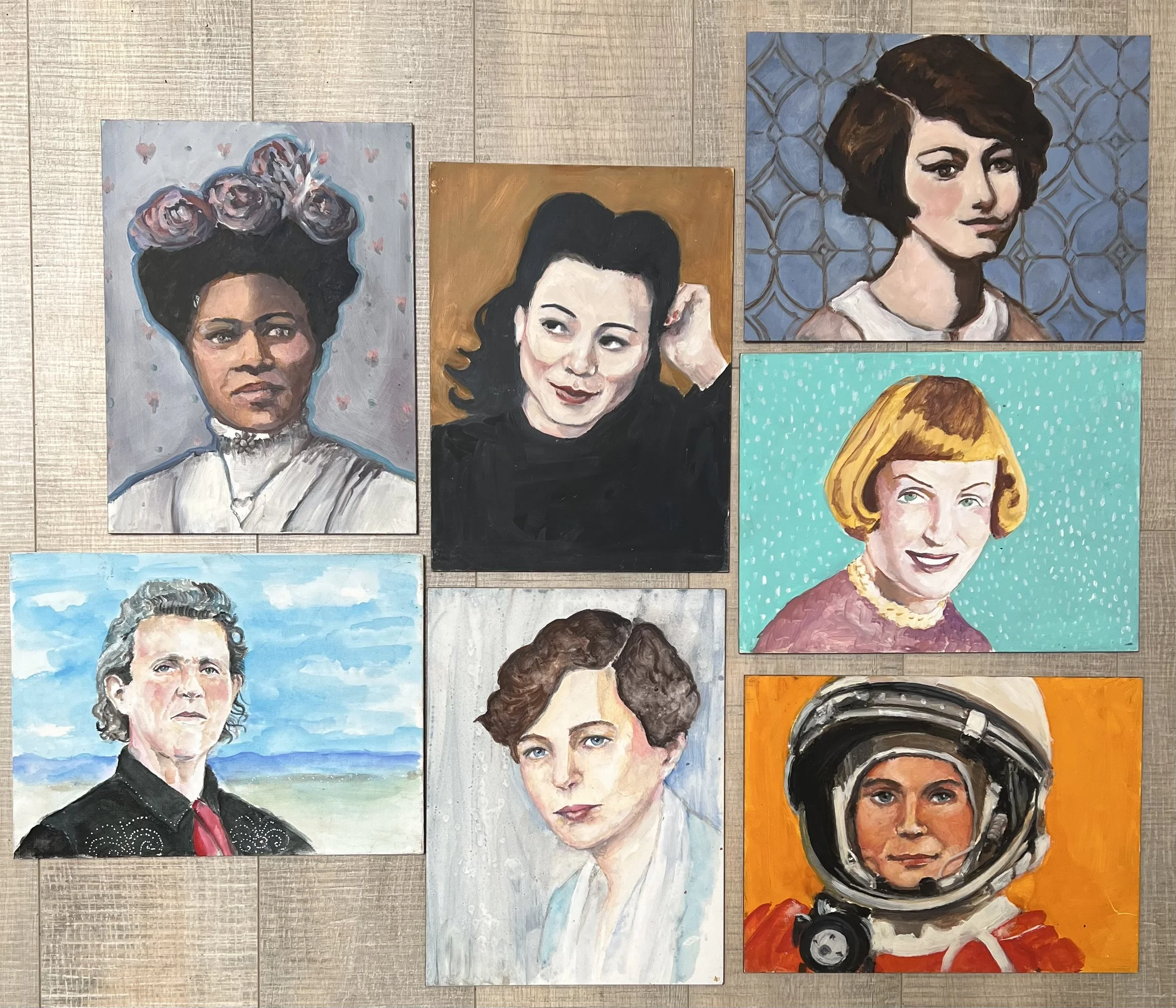 clockwise from top left: Nannie Helen Burroughs, Mine Okubo, Dorothy Parker, Mary Blair, Valentina Tereshkova, Maria Goeppert-Mayer, Temple Grandin